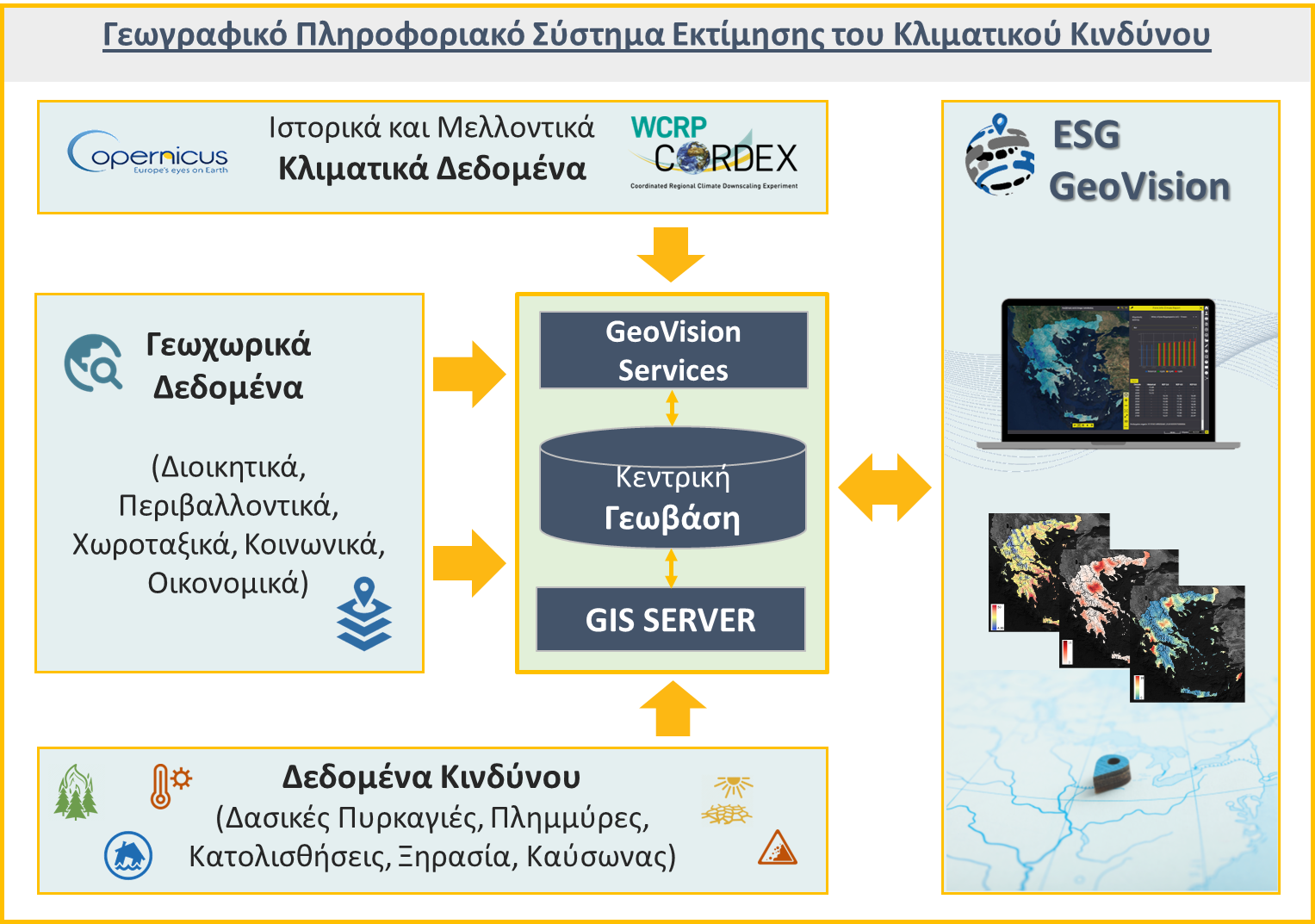 Το Γεωγραφικό Πληροφοριακό Σύστημα Εκτίμησης του Κλιματικού Κινδύνου ESG GEoVision είναι μια διαδραστική χαρτογραφική πλατφόρμα που αποσκοπεί να οργανώσει και να παρέχει πρόσβαση σε κλιματικά και άλλα σχετικά γεωχωρικά δεδομένα με στόχο να εκτιμήσει και να αποτυπώσει τον κίνδυνο από Φυσικά Φαινόμενα άμεσα συσχετιζόμενα με την Κλιματική Αλλαγή όπως είναι οι Δασικές Πυρκαγιές, οι Πλημμύρες, οι Κατολισθήσεις, η Ξηρασία, και ο Καύσωνας. Με τη χρήση της εφαρμογής οι χρήστες έχουν τη δυνατότητα να πλοηγηθούν σε μια σειρά δυναμικών διαδικτυακών χαρτών που συγκεντρώνουν δεδομένα ευαισθησίας, έκθεσης και τρωτότητας σχετικά με τους ανωτέρω κινδύνους και να εξετάσουν πως αυτά αναμένεται να διαμορφωθούν στο μέλλον, σύμφωνα με τα μέχρι τώρα διαθέσιμα κλιματικά δεδομένα και σενάρια.